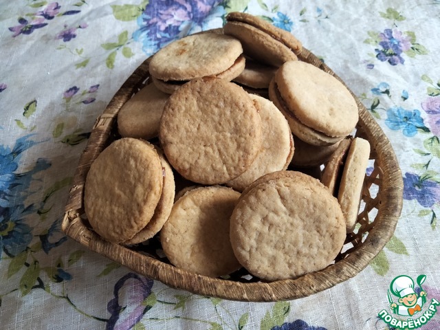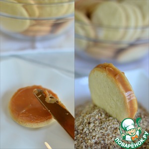 Собрать печенье. Для этого нужно одно печенье намазать вареной сгущенкой и накрыть его вторым. Склеенное печенье смазать сгущенкой по шву. Прокатить печенье колесиком по обсыпке. Я использовала: кунжут, грецкие орехи, мак, кокосовую стружку и кондитерскую посыпку.