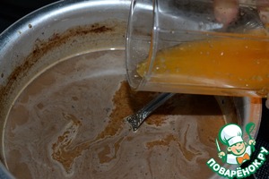 Нагревать на медленном огне. Не переставая мешать, добавить мандариновый сок минуты на три. Не дайте молоку закипеть.
