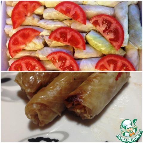 Залить голубцы овощным бульоном и выстелить сверху нарезанными дольками свежего помидора.