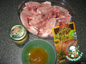 Смешать горчицу с медом, солью и приправой. Обмазать этой смесью мясо.