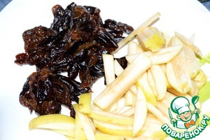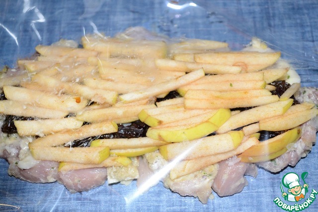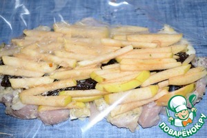 • После того, как мясо впитало в себя все вкусовые качества специй, лимона, вина, начинаем формировать рулет. Часть мяса раскладываем в рукаве для запекания равномерно, распределяем чернослив и яблоко.