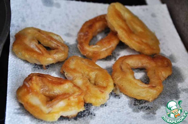 Сухие кольца обваливала в муке, в кляр и в масло - идеально, кляр пышный, весь на месте (ни одного испорченного колечка), ни единой брызги. Вкусно!