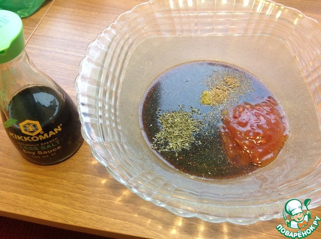 В посуде, где будет мариноваться мясо, делаем маринад: Соевый соус, к нему добавляем соус Чили, тимьян, хмели-сунели, кинзу и перемешиваем |