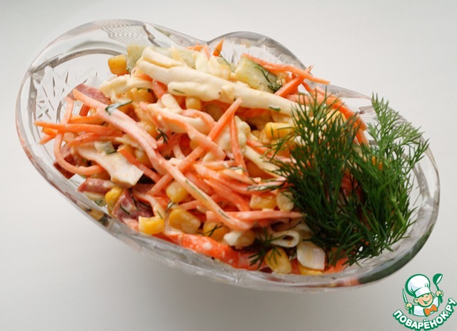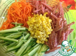 В салатницу выкладываем корейскую морковь, тонкими полосками режем огурцы и колбасу, лишнюю жидкость с кукурузы сливаем