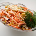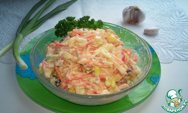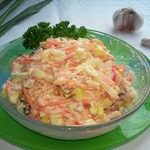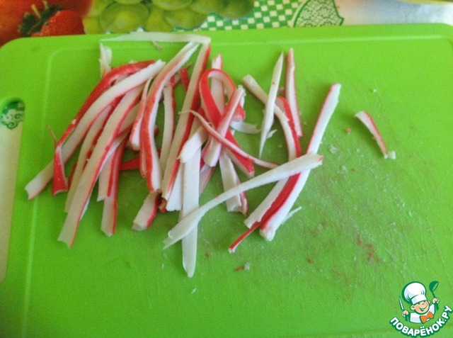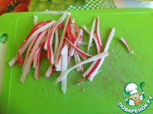 Так же тонкими полосками режем крабовые палочки и добавляем к салату