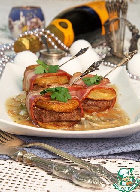 Сегодня я оставила свои девичьи легкие рецепты)) и пришла к Вам с настоящим, полноценным праздничным горячим блюдом, которое обязательно порадует Ваших мужчин за новогодней трапезой. Мясо, картошка и бекон в интересной подаче. Готовится, конечно, не очень быстро, но зато приготовления можно провести заранее, а перед подачей останется только запечь немного в духовке. Заходите, это вкусно!