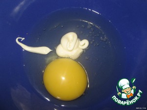 Из яиц делаем маленькие блинчики омлетики. Для этого яйца по одному разбиваем в миску, добавляем соль, перец, капельку майонеза.