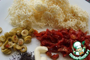 Три плавленных сырка натереть на терке (или взять 300 гр любого мягкого сыра), нарезать примерно 100 гр вяленых томатов и штук 10 оливок. Добавим щепотку сушеного базилика (регана).