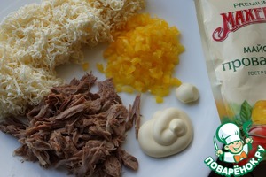 Три плавленных сырка (или 300 гр любого мягкого сыра) смешать с болгарским перцем, отварным сухим мясом. У меня была индейка. Сухое - это означает, что когда мясо достали из бульона, положите его в дуршлаг, чтобы бульон стек, и мясо обсохло. Добавляем майонез и зубчик чеснока, пропущенного через пресс. -