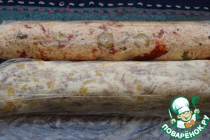 Полученные сырные массы сложить в разные одноразовые пакеты (или пищевую пленку), скатать в "колбаски".