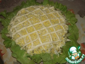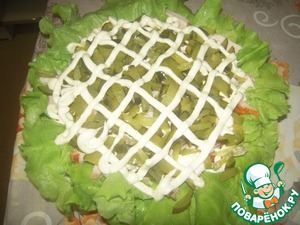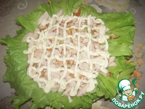 Начинаем выкладывать слоями основные ингредиенты нашего салата: грудка куриная копченая - майонез