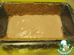 При остывании карамельная смесь становится достаточно густой и чем сильнее она остывает, тем более плотной становится. Поэтому используйте ее сразу: нанесите сливочную карамель поверх застывшего мусса. Накройте оставшейся полоской бисквита и прижмите, чтобы карамель распространилась по всему дну. Уберите на ночь в морозильную камеру.