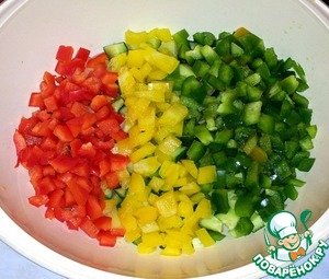 Нарезать перец. Желательно трёх цветов - для яркости салата.