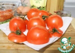 Подготовить продукты. Вымыть и обсушить помидоры. Предварительно отварить яйца вкрутую.