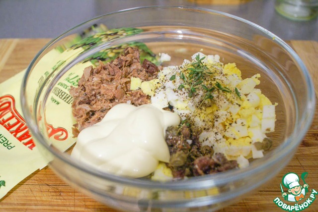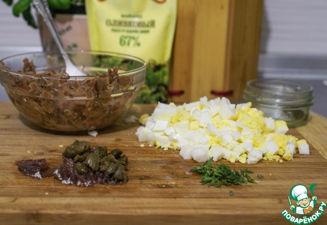 Тунца размять вилкой, нарезать яйца, измельчить зелень, анчоусы и каперсы.
