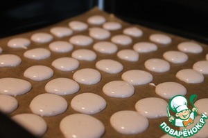 Противень застелить бумагой для выпечки и выдавить безе кружочками 3-4 см, больше не стоит. Подозреваю, мое безе было взбито не совсем как надо, оттого у меня получились прямо-таки макаронс))) -