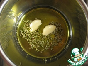 А пока варится фасоль, займемся заправкой. Наливаем оливковое масло в небольшую посуду, бросаем туда пару зубчиков чеснока и половину чайной ложки розмарина. Ставим на огонь. Как почувствуем запахи и услишим потрескивание — снимаем с огня и оставляем минут на 20, чтобы запахи успели пропитать масло.