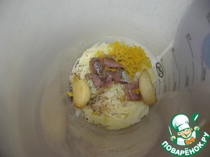В чашку блендера складываем: чеснок, вытащенный из масла, натертый пармезан, пару анчоусов, цедру и сок лимона, черный свежемолотый перец и соль. Пробиваем, добавив туда также немного нашего ароматного масла. Но не все — часть оставляем.