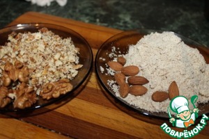 Миндаль измельчить в муку, грецкие орехи средне растолочь (не в муку, а чтоб кусочки были мелкие)