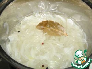 Приготовить маринад: на 1 стакан воды добавить соль, сахар, уксусную эссенцию, перец горошком. Поставить на огонь и дать закипеть