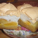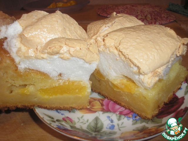 Когда пирог практически готов, вытаскиваем его с духовки и очень быстро по всему пирогу выкладываем белковую массу и отправляем пирог опять в духовку на 5-7 мин