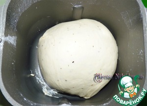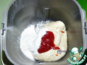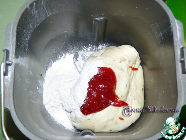 Меньшую часть теста положить обратно в форму, добавить 1 ст. л. томатной пасты и 2 ст. л. муки, выберите опять программу Тесто.