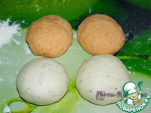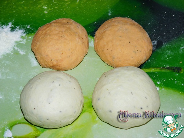 Белое и томатное тесто делим на 2 части, всего у нас получится 4 кусочка теста.
