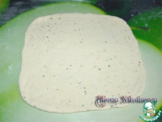 Каждый кусочек теста раскатать скалкой в прямоугольный пласт, толщиной примерно 0,5 -1 см.