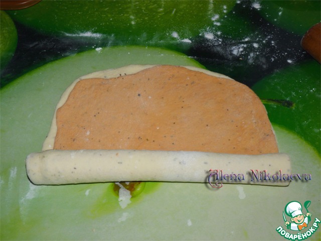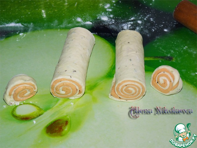 То же самое проделать с оставшимися кусочками теста, только сначала кладем красное тесто, а сверху белое тесто и так же сворачиваем в рулетик. -