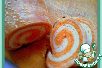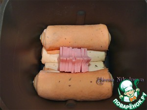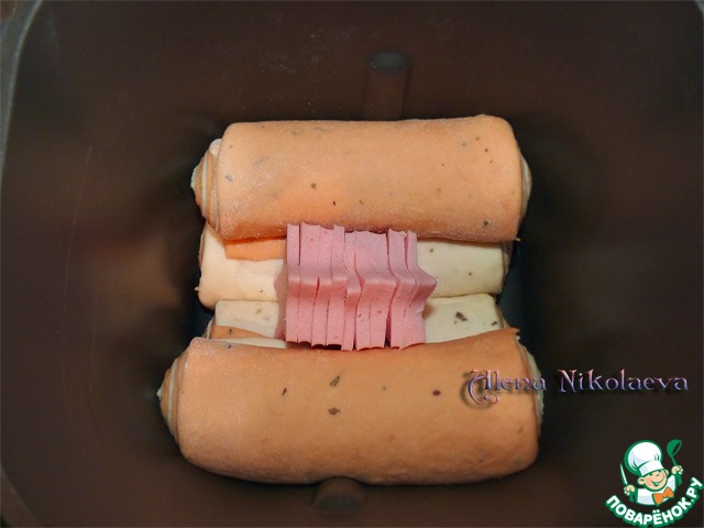 В форму для хлеба положить 2 белых рулета параллельно друг дружке, затем сверху уложить так же остальные томатные рулеты. В форме не должно быть тестомешалки!!!