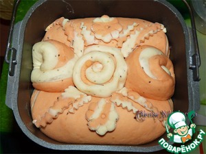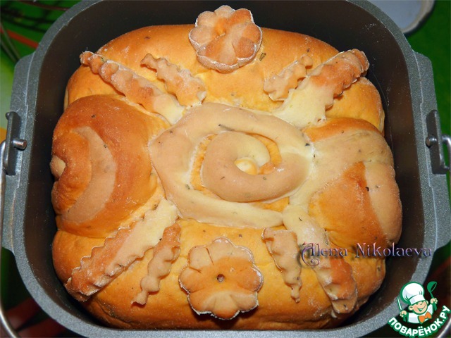 все нюансы рецепта что у Алены взяты с темы "Хлеб Рыжая завитушка". Естественно этот мой хлеб на вид не очень похож что там на фото, такой с небольшими завитками у меня получился первый хлеб, могу показать фото если потребуется, я его меняла под себя, добавляла травы, парику, колбасу и разные добавки, меру весов ингредиентов я меняла под свою печь, потому что чашка у меня меньше чем в указанном рецепте.