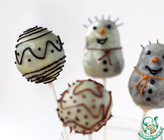 В преддверии праздника я, конечно, выбрала новогоднюю тему, так как решила делать снеговиков с новогодними шарами и покрывать белым шоколадом, бисквит сделала с добавлением какао для контрастности. Можно делать бисквит без какао, он получится светлым, а покрыть можно темным шоколадом.