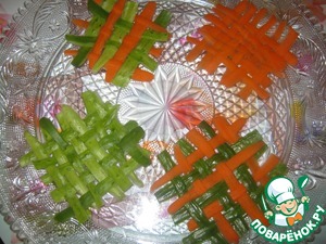 • Нарезать овощечисткой полоски из огурца и моркови.