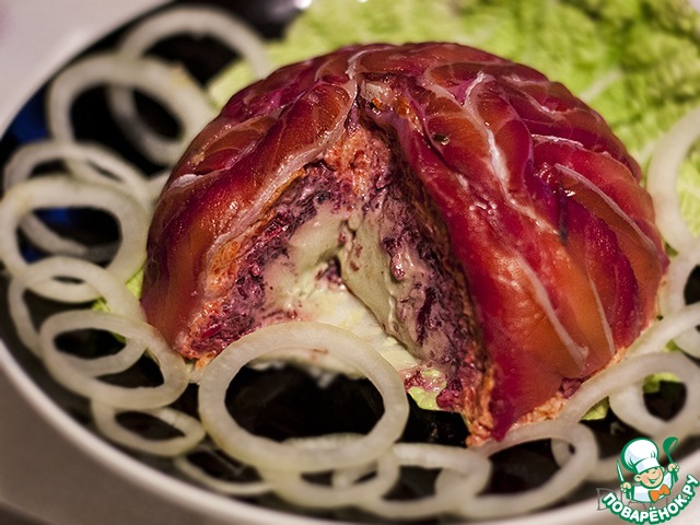 Небольшие порционные емкости выстелить пищевой пленкой. Поверхность формы выложить ломтиками рыбы. Затем по окружности слой свеклы, слой моркови и внутрь пасту из Феты с авокадо.