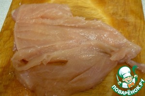 Куриное филе промыть, просушить и распластать. Из 1 филе получается 2 таких заготовки. То есть, всего их будет 8 штук.