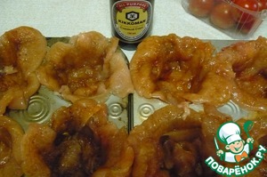 Теперь формируем стаканчики. Форму для кексов смазываем маслом. Каждое филе смазываем соусом и посыпаем перцем. (Я брала перец, который мне прислала Златочка. Хочу сразу предупредить тех, кто им не пользовался. Он имеет своеобразный вкус. Поэтому, попробуйте его.) И укладываем каждое филе в форму. Там не должно быть дыр, для этого сдвигайте филе, перекрывая их.