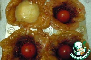 В оригинале идет сыр Моцарелла. Но такой я не нашла и использовала мягкий деревенский сыр. Нарезаем небольшими кружками и кладем сверху на все начинки. Закрываем края свисавшим филе. Можно посыпать сверху перцем.
