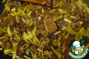 Обжаренные грибы положить на сковороду, добавить тонко резанный лук - порей. Пережарить 5-10 мин. до мягкости лука. Я брала грибы, которые заготавливала на зиму, они уже соленые.