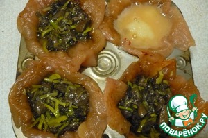Капусту вынуть, немного остудить и положить одну штуку в куриный стаканчик. Залить ее яйцом.