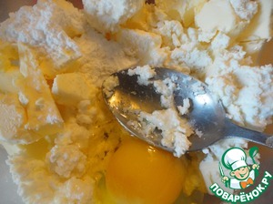 Готовим крем. Добавляем к 150 гр творога 100 гр размягченного масла, 2 ст. л. сахарной пудры, помытое предварительно с мылом яйцо (все бактерии на скорлупе), ванильный сахар. Перемешиваем сначала ложкой.