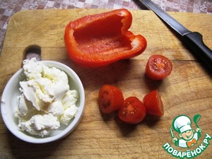Перец почистить. Черри помидоры порезать на половинки. Крем-сыр смешать с Фетой.