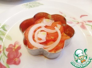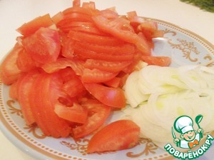 Лук режем полукольцами, а помидоры на дольки-четвертинки.
