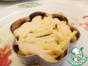 Затем слой сыра и смазываем его соусом, слегка утрамбовывая.