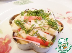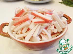Теперь выкладываем крабовые палочки и слегка смазываем их майонезным соусом. Посыпаем рубленным укропом.