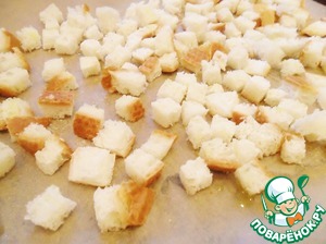 Теперь выкладываем наши хлебные кубики на противень, слегка присаливаем и сбрызгиваем любимым маслом (я брала кунжутное). Убираем на 190-200 градусов на 5-7 минут - но приглядывайте за ними - духовки у всех разные и ваша может оказаться злее и превратить сухарики в горелики!
