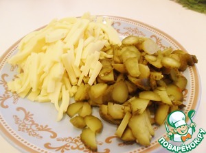 Также делаем нарезку маринованных огурчиков и сыра. Сыр можно потереть на крупной терке.