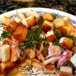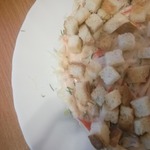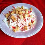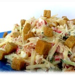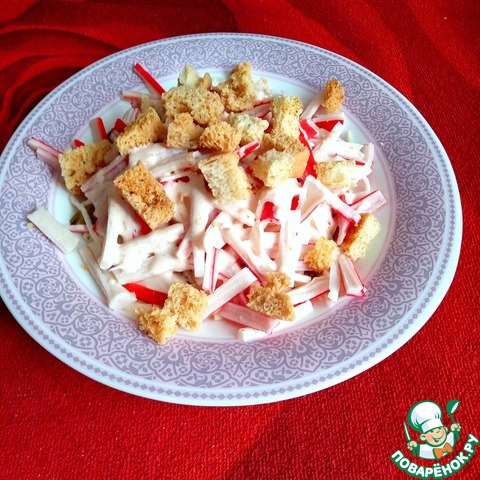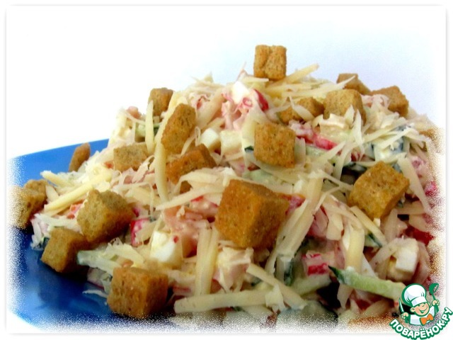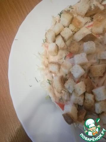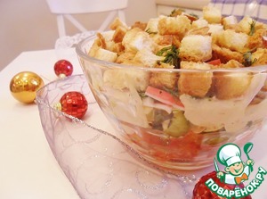 И конечно же, наши хрустики! Снимите формочку с салата и аккуратно украсьте сухариками.
