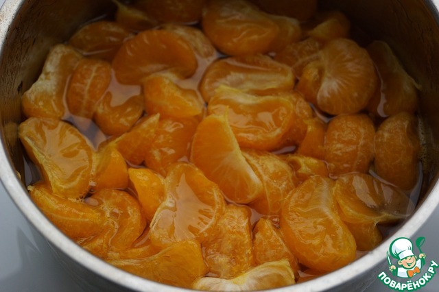 В сироп от варки мандаринов выжимаем сок одного мандарина и ставим на маленький огонь увариваться.