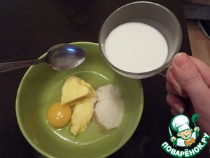 Смешать масло, сахар, молоко, яйцо, в одной посуде, размешать. Добавить гашеную соду, еще раз перемешать.