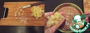 Порезать консервированные ананасы на небольшие кусочки (100 гр). Добавить в тесто кусочки ананасов и перемешать.